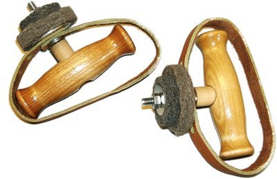 Poignées en bois, lanière en cuir réglable sur trois positions.