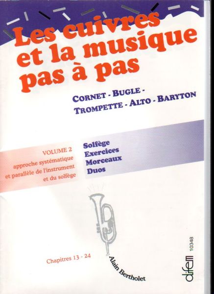 Pour cornet, bugle, trompette, alto et baryton. Volume 2 approche systématique et parallèle de l'instrument et du solfège. Solfège, exercices, morceaux et duos. Chapitres 13 à 24