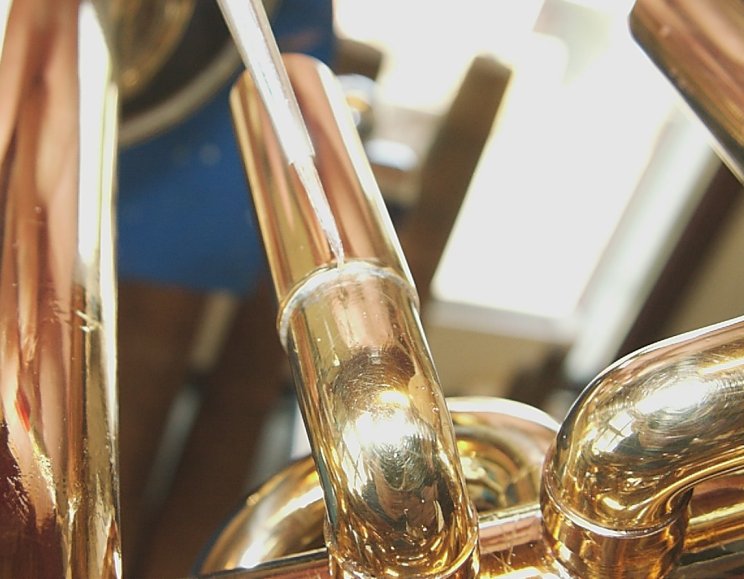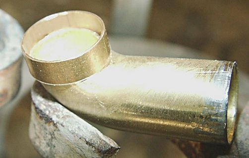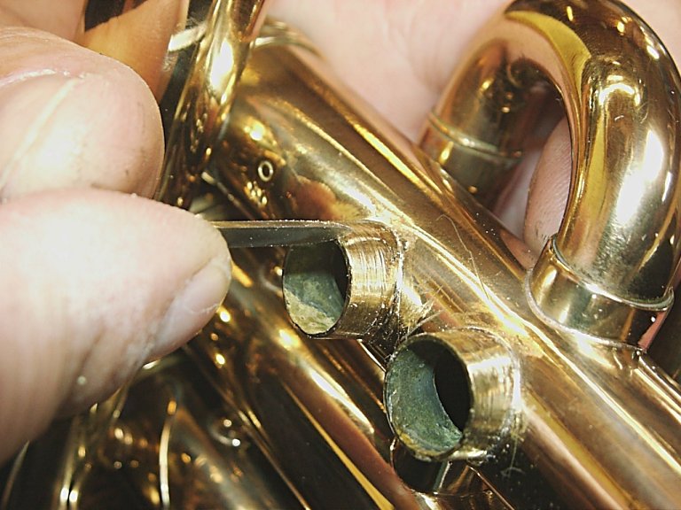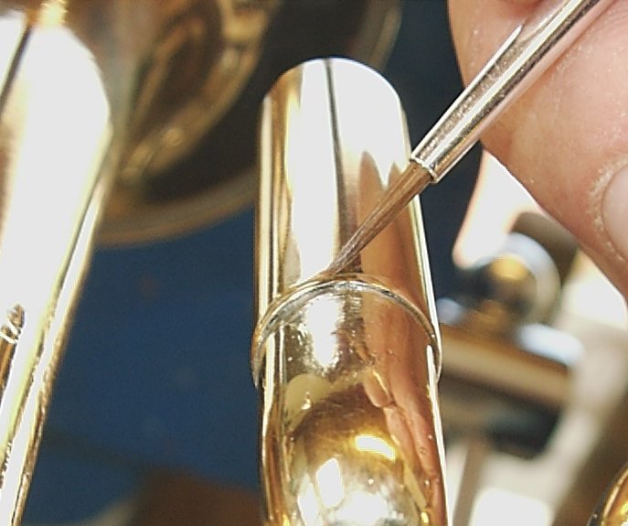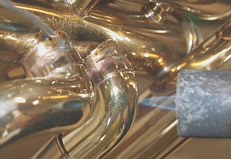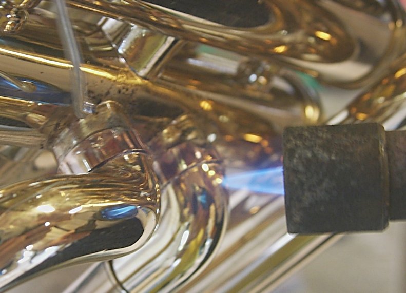 Montage de la pièce obtenu sur la trompette, avec une flamme la plus froide possible afin de ne pas abimer la laque de la trompette.