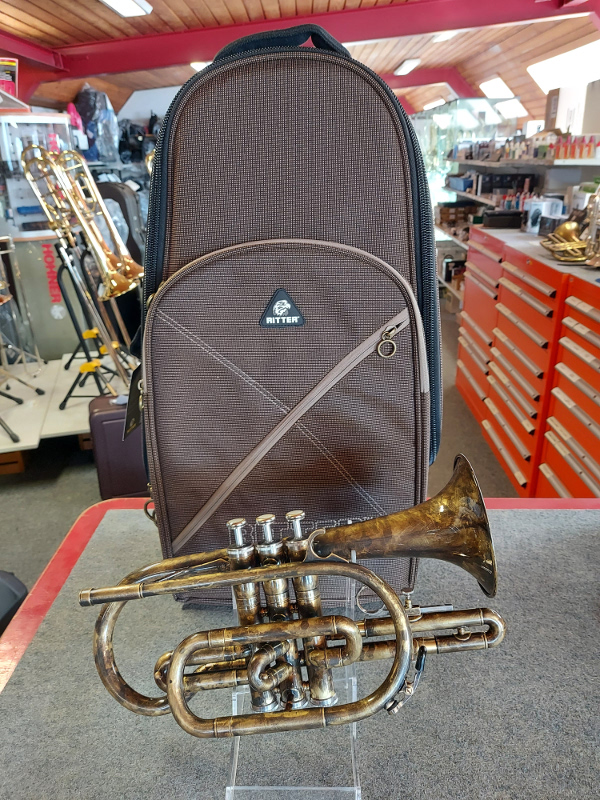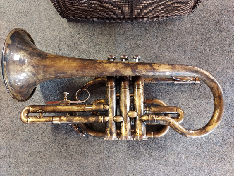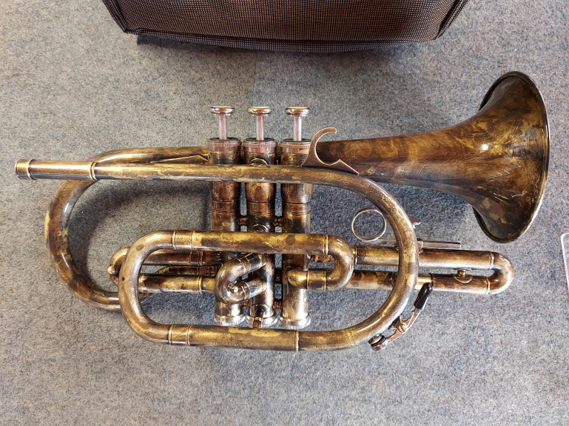 Cornet finition antique, révisé dans notre atelier, branche d'embouchure neuve, pièces d'usure changées. Avec gig bag neuf, embouchure, huile, chiffon de nettoyage