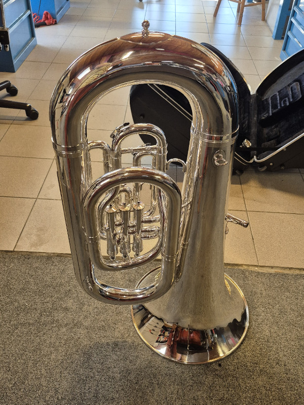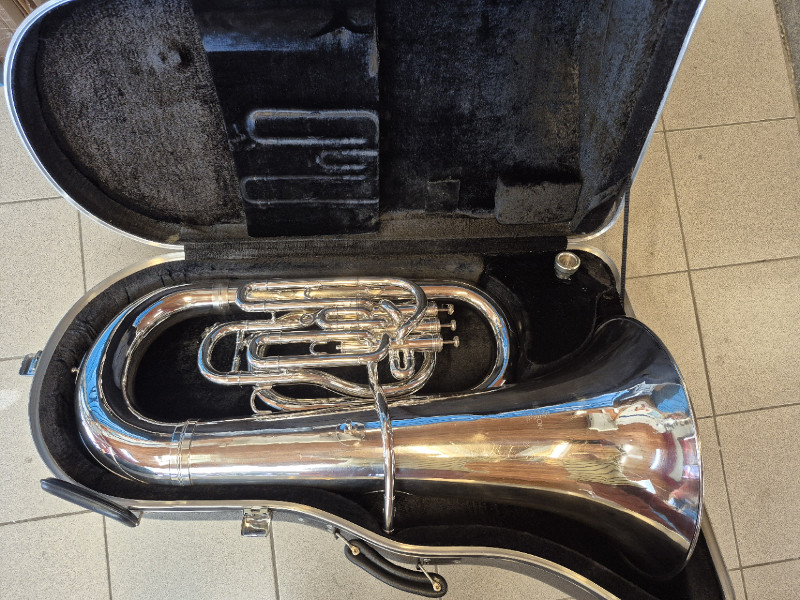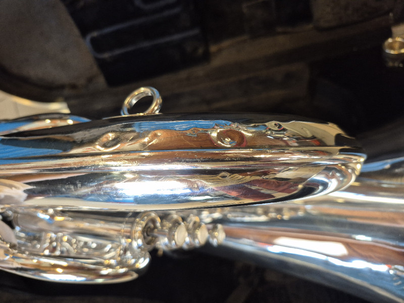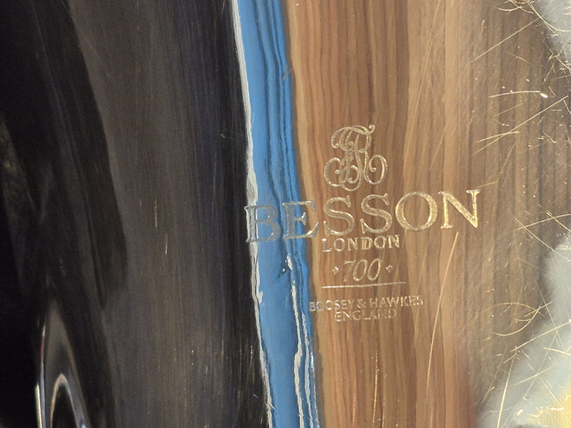 Instrument révisé en bon état, pistonnage monel. Quelques petites bosses mais aspect très bon. Joue très bien. Avec étui, lyre embouchure huile.